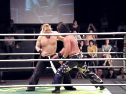 KUDOストンピング、ボディスラムから倒立式ダブルニードロップ(左写真)、カウント2。5分経過。