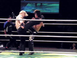 KUDOヒザ蹴り連打(右写真)、梶はエルボー返す。KUDOミドルキック、ヒザ蹴り、HARASHIMAにタッチ。