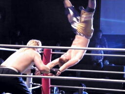 KUDO「死ね!」と叫んでコーナーからダイビングダブルニードロップ(右写真)、