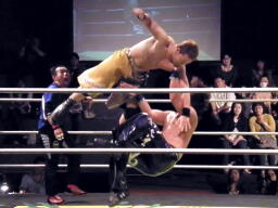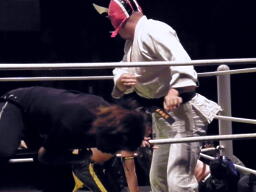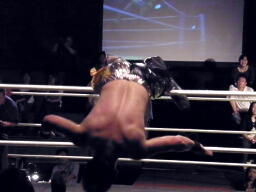 梶ボディスラム、ロープに飛ぶとローリングサンダー(右写真)、カウント2。