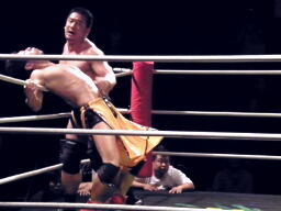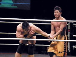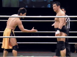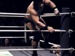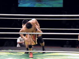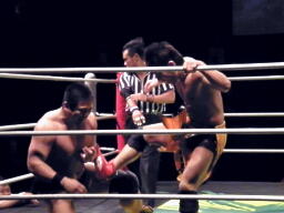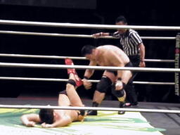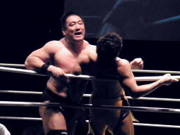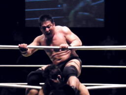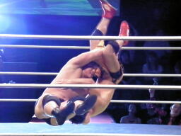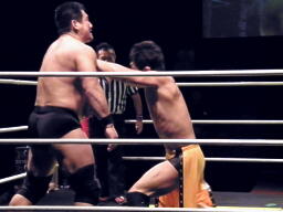 高梨チョップ、トラースキック、タカタニック、高木ブロック。高梨ロープに飛ぶ、高木サンシローズライン(右写真)。もう一発クローズライン、カウント2。コーナーに上げてホイッパースナッパー、カウント2。