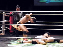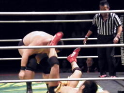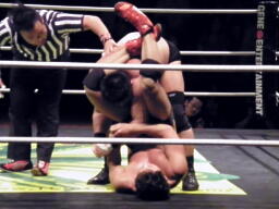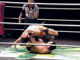高木肩車、高梨エビに丸め込み、クリアされるとイナヅマ2連発(左写真)、カウント2。