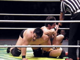 腕をクロスして絞り上げる(左写真)、これはどういうジャベなんだろか。高木はロープ。