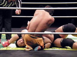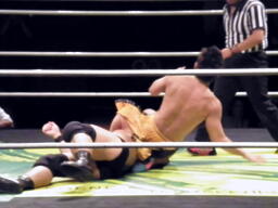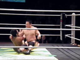 高木前転式弓矢固め(右写真)、高梨の両肩をマットに付ける、カウント2。5分経過。