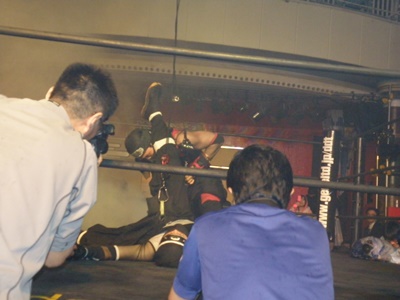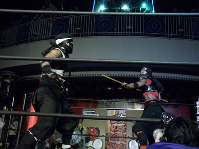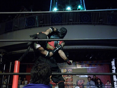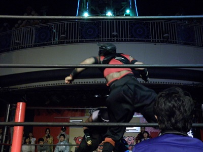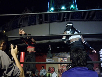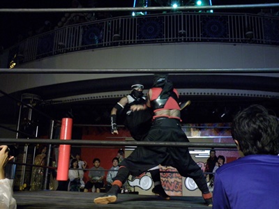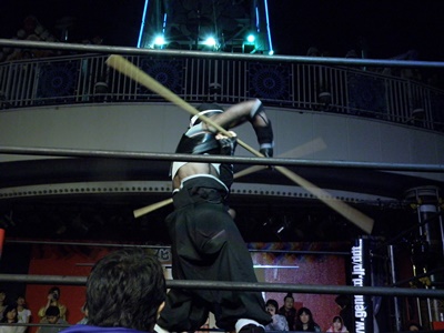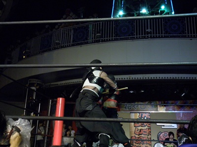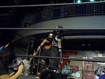 さすがに素早い動き。しかし忍者同士の闘いなので「プロレス」とは違う。