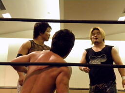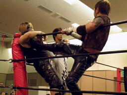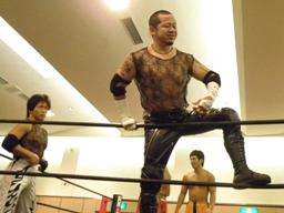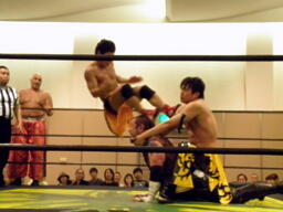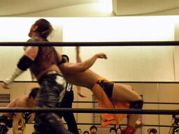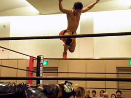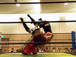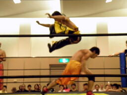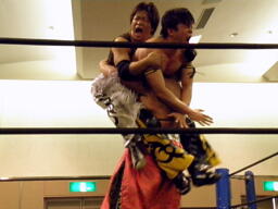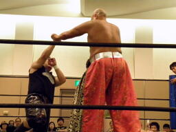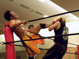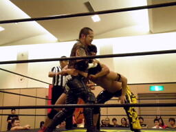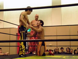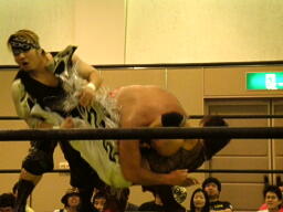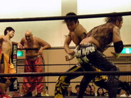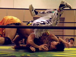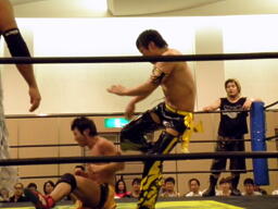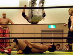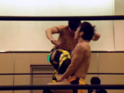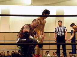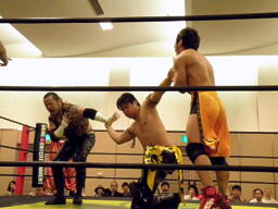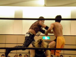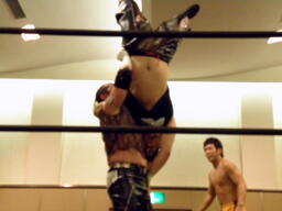 MIKAMIボディスラム、ウラノボディスラム、KUDOにタッチ。KUDOボディスラム、ウラノにタッチ。ウラノボディスラム、セントーン。MIKAMIもセントーン(左写真)、カウント2。