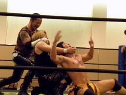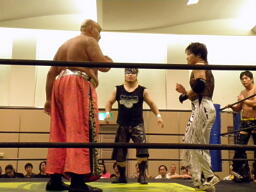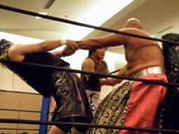 KUDOとMIKAMIがダブルでコーナーに振り突っ込む、星誕期は2人まとめてベアハッグ(右写真)。葛西がカット。葛西と星誕期がチップの打ち合い。星誕期ボディスラム、葛西着地。バックの取り合いから葛西は急所蹴り、さらにドロップキック。