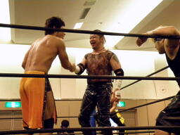 高梨は葛西に「ウラノを先につぶそう」と共闘を申し入れる。両者握手(左写真)、2人でウラノにガットショット、コーナーで踏みつけ。ウラノはレフェリーの見てないところで「ギブアップ!」攻撃やめさせる。5分経過。