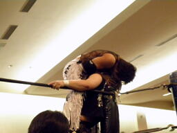 MIKAMIコーナーに詰めて耳元で大声(右写真)、「ヤ!ス!ウ!ラ!ノ!」とパンチ5連発。高梨が「ミッキーやっちゃって!」と声を掛けるとMIKAMIは「はいよ!」と応えてブロンコバスター。すかさず高梨がカバー、カウント2。MIKAMIは葛西にタッチ。