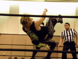 葛西とKUDOがロックアップ、葛西ヘッドロック、高梨も葛西にヘッドロック。ロープワーク、高梨が振られる、KUDOリープフロッグでかわす(右写真)、葛西がショルダーブロック。KUDOロープに飛ぶ、葛西ヒップトス、KUDOブロックして逆にヒップトス、ドロップキックのスカし合いからカバーの攻防、ポーズ。高梨は何もしていないが前転してポーズ。