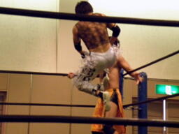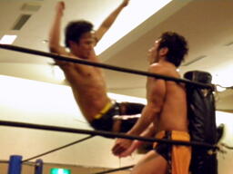 星誕期がブエノスアイレス午前零時を狙ってコーナーに上る、高梨「リーダーに譲れ!」と星誕期を下げるとダイビングニードロップ、ウラノかわす(右写真)。そんな技普段やってないじゃないか!ウラノはKUDOにタッチ。
