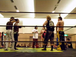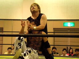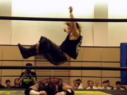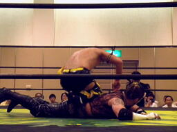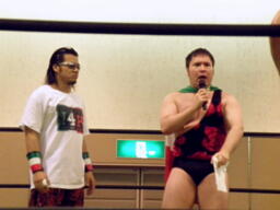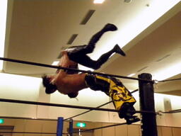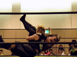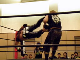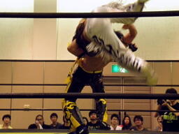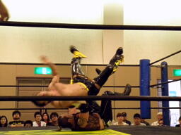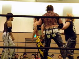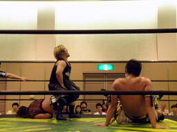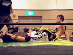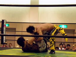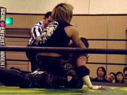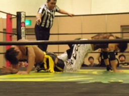 KUDOドラゴンスクリューから再度足4の字固め、MIKAMI返す(右写真)。ウラノが戻し、さらにニードロップ、MIKAMIロープ。KUDO足を取る、MIKAMI延髄蹴り、KUDOかわすがMIKAMIはバックキック、葛西にタッチ。25分経過。