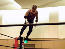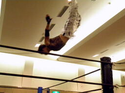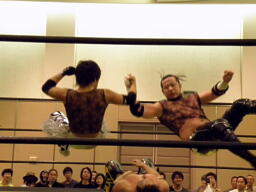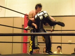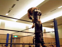 葛西ボディスラム、パールハーバースプラッシュ狙ってコーナーに上る、ウラノが阻止(左写真)。