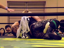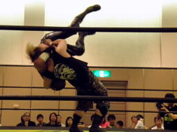 葛西はMIKAMIにタッチしようとする、しかしMIKAMIはまだ場外。葛西はMIKAMIを気遣いながらリングに戻す。KUDOがMIKAMIにブレーンバスター、MIKAMI体をひねって着地するが(左写真)、さらに足を痛める。KUDOはウラノにタッチ。