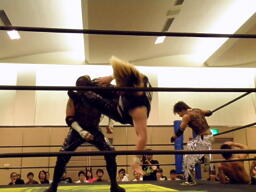 KUDO雪崩式ブレーンバスター(右写真)、カウント2。KUDOはウラノにタッチ。