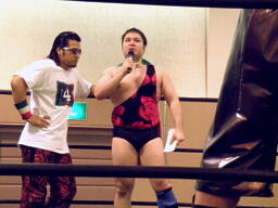 アントンとガッバーナがリングに(左写真)。「イタリアン・フォーホースメンのお父さん、黒板五郎であるフランチェスコ・トーゴーから手紙を預かってきた!だまって聞けよ!『富山大会で行われるタッグの3WAY、勝ったチームの挑戦をトーゴー&PIZA組は両国国技館で受けることを認める。』で、どっちが勝ったんだ?」