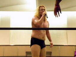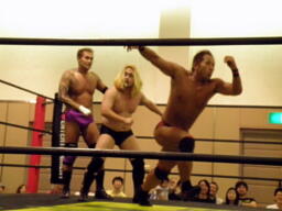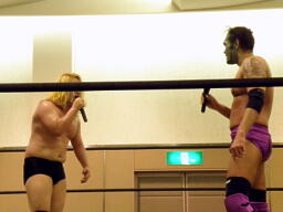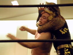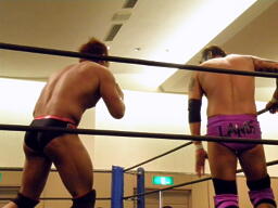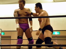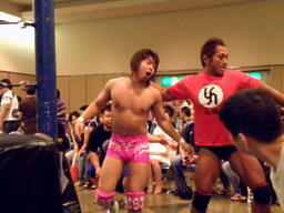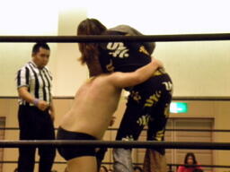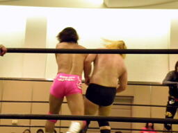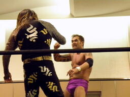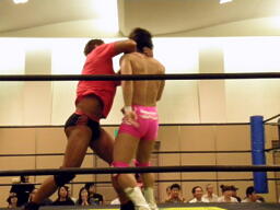 マイケルと石井リングに戻ってエルボーの打ち合い(左写真)。マイケルがボディスラム、カウント2。またエルボーの打ち合い、マイケルロープに飛ぶ、石井ドロップキック、マイケル場外に。高木と矢郷が戻る。