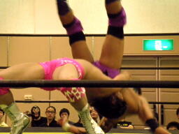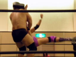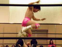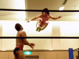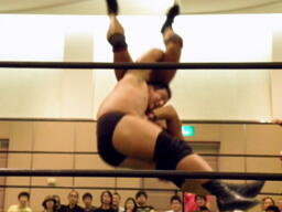 高木は3人で太鼓の乱れ打ち。高木ロープに固定すると「地元でいいカッコしてんじゃねえ!お前は汁レスラーだ!」と叫んでヒップドロップ(右写真)。親戚の前でひどい。カバーはカウント2。ポイズンにタッチ。5分経過。