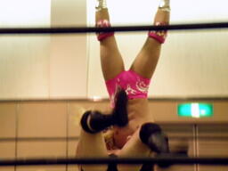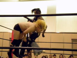 ポイズンチョークスラム、ロープに飛ぶ、矢郷は殺人コブラツイスト(左写真)、ポイズンはグリーンミストでブレーク。