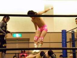 高木ロープに振ってエルボー、ロープに飛ぶ、大家ランニングネックブリーカードロップ(右写真)、矢郷にタッチ。