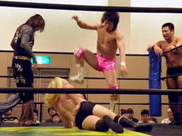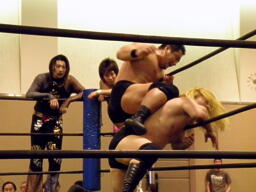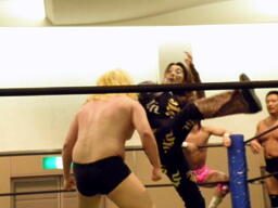 矢郷ハートパンチ、ロープに飛んでニールキック(左写真)、大家にタッチ。大家は高木にストンピング。高木逆水平、ポイズンを呼び込んでダブルのショルダーブロック。