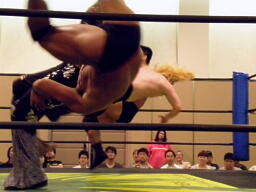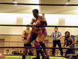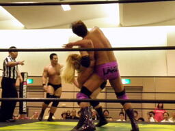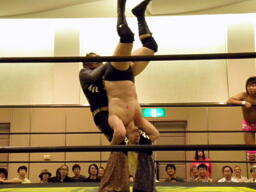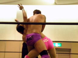 大家垂直落下式ブレーンバスター(右写真)、カウント2。大家も見た目が似てるからラム・ジャム使えばいいのに。石井は大家に張り手、ニールキック、ポイズンにタッチ。大家も矢郷にタッチ。