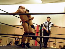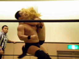 矢郷が投げっ放しフルネルソンスープレックス(左写真)、カバー、カウント2。
