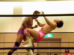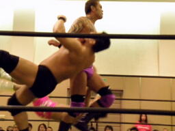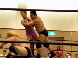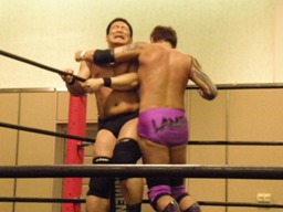 高木サンダーファイヤーパワーボム、マイケル着地してガットショット、ロープに飛ぶ、高木追いかけてサンシローズライン(右写真)、ロープに飛んでもう一発クローズライン、カウント2。