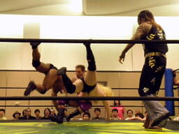 石井ロープに飛ぶ、マイケル肩に担ぐとバックフリップ(右写真)、大家にタッチ。