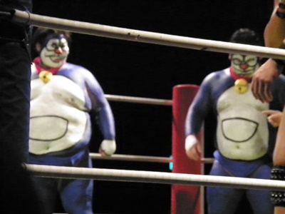 1号入ってマイケルをロープに振るとダブルのクローズライン、マイケルかわすと2体の尻尾を引っ張る(右写真)。猫型ロボットは尻尾がスイッチなのだ!