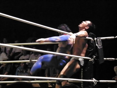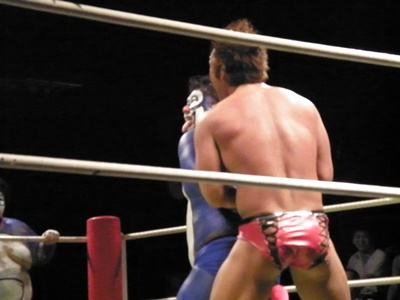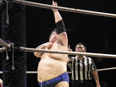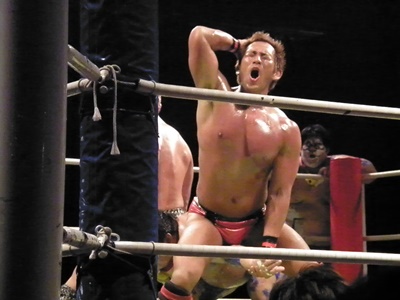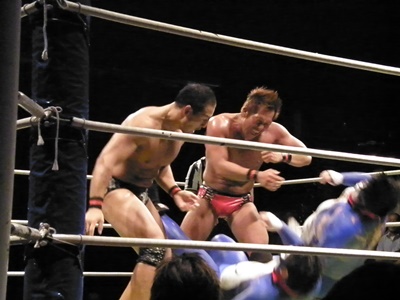 谷口ヘッドロック、1号ロープに振る、谷口ショルダーブロック。1号ロープに飛んで谷口にショルダーブロック(左写真)。
