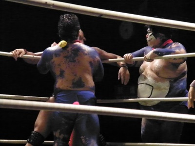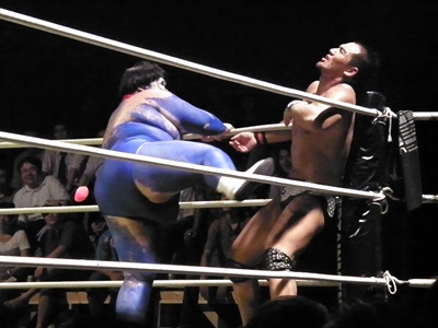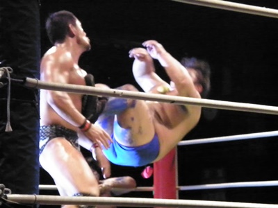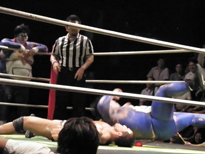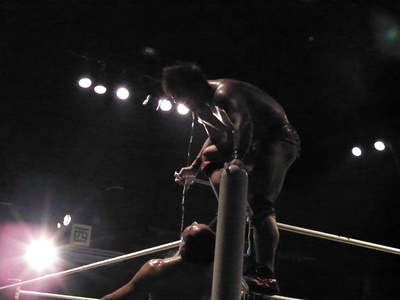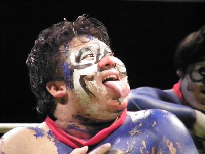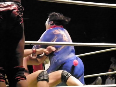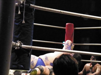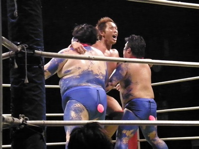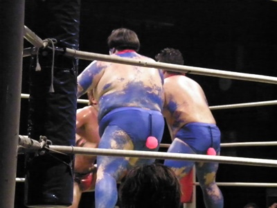 1号入り串刺しラリアット(右写真)、谷口ダウン。マイケルが入り谷口の体にローションを垂らす。
