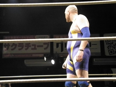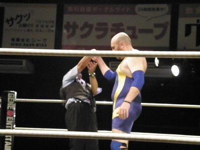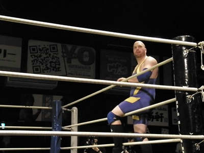 後半戦を始めようとすると見慣れない外人選手がコスチューム姿で乱入(左写真)。マイク・エンジェルスだ!