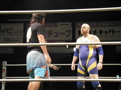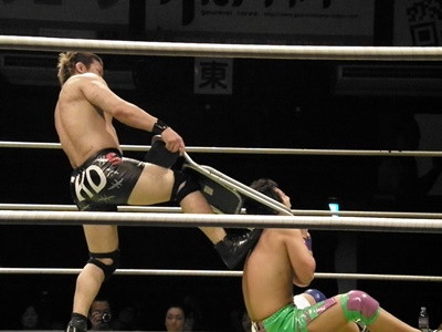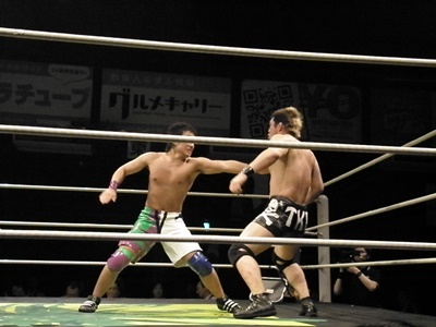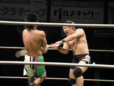 安部ドロップキックで先制、チョップ打ち込む(右写真)。竹田ヒザ蹴りで動きを止めチョップ、ヘッドバット。