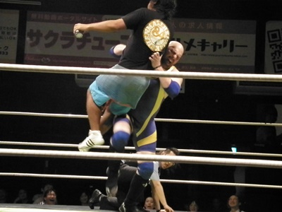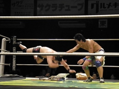 竹田は投げっ放しジャーマン、イスの上にアニメグッズを置いてそこに国体一回戦スラム(左写真)、上からポスターで押さえ込んで3カウント。