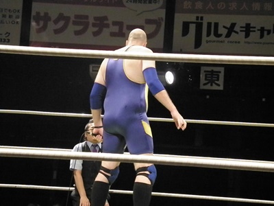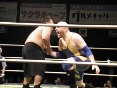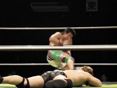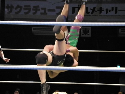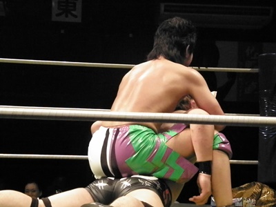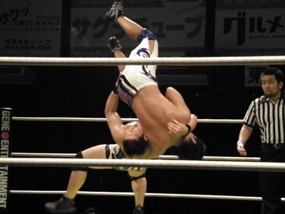 安部ブレーンバスター狙うが竹田が切り返し逆に投げる(左写真)。