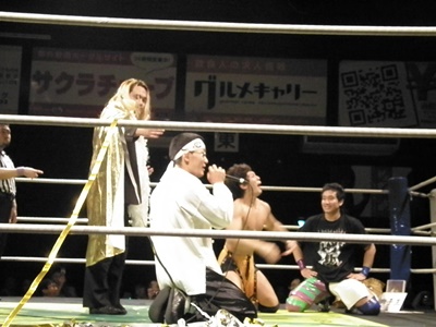 安部に力を与える獅子王様(左写真)、花道に玉座を設置してそこで試合をご覧になることに。西調布と同じようにSTYLE-Eの弥武リングアナの実況付きで試合は進む。