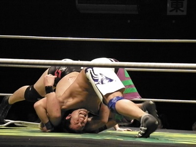 竹田ジャーマン狙う、安部切り返して逆さ押さえ込み(左写真)、カウント2。