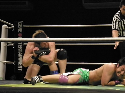 高梨と趙雲が入ってカット(右写真)。ダブルで振るが竹田は2人にラリアット。