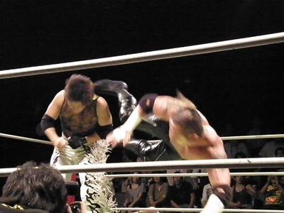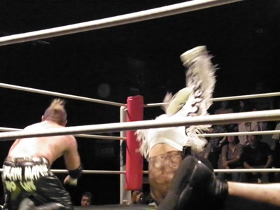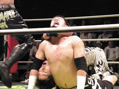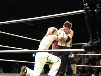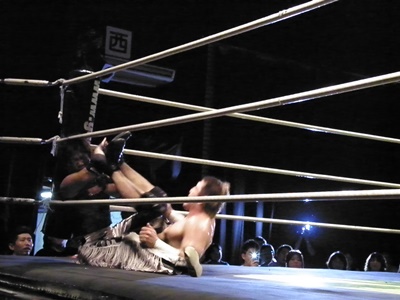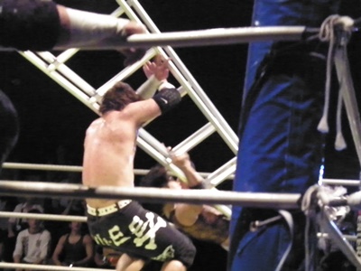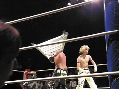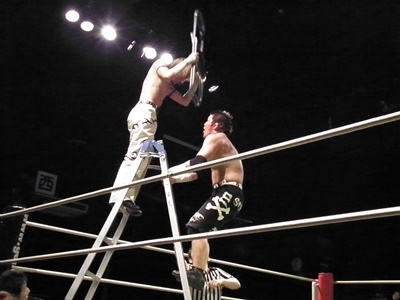 葛西リバースタイガードライバー狙う、MIKAMIフランケンシュタイナーに切り返す(右写真)。MIKAMIラダーをリングに入れる。15分経過。