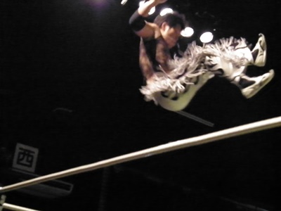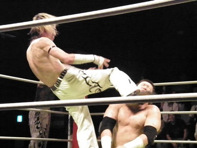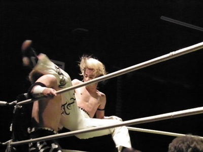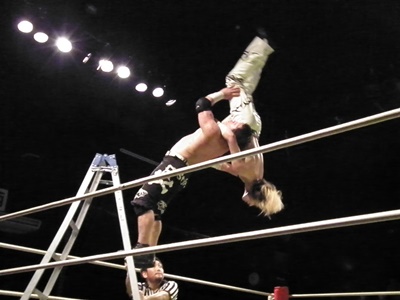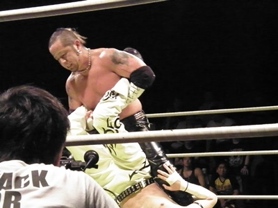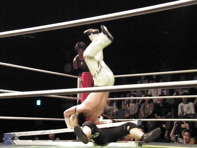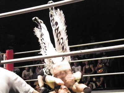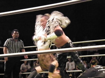 竹田ジャーマン、MIKAMIスク〜ルボ〜イに切り返す、竹田再度持ち上げてジャーマン(右写真)、イサミがカット。葛西と竹田がラダーを抱えてクローズライン、イサミはカウンターのドロップキック。