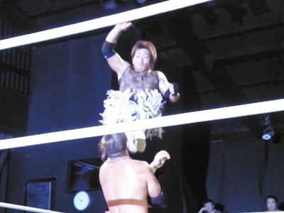 イサミがコーナーに上りイス付きダイビングダブルニードロップ(左写真)、カウント2。イサミラダーに上って再度ニードロップ狙う、葛西がイス投げつけて落とす。