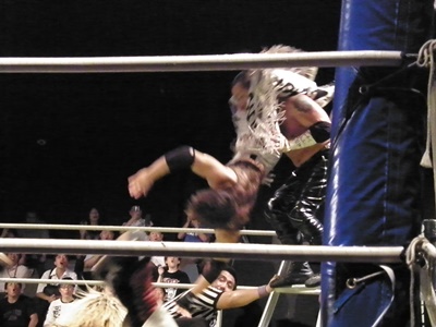 MIKAMIスワンダイブ狙う、葛西がドロップキックで撃墜。葛西のラリアットでMIKAMI一回転(左写真)