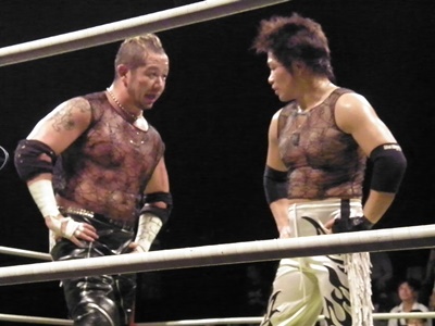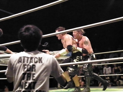 手四つから葛西がバック取ってグラウンドに持ち込む。腕の取り合い、葛西はロープでイサミの腕を攻める。場外戦に(左写真)。リングに戻すとボディスラム、カウント1。竹田にタッチ。5分経過。