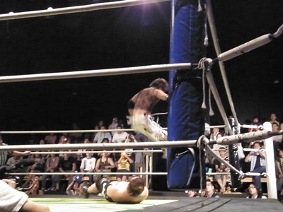 イサミは葛西を場外に落とすとコーナーから場外の葛西へイス付きダイビングダブルニードロップ!(右写真)これは凄い。