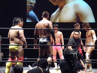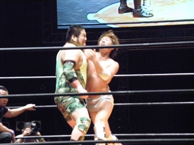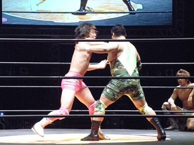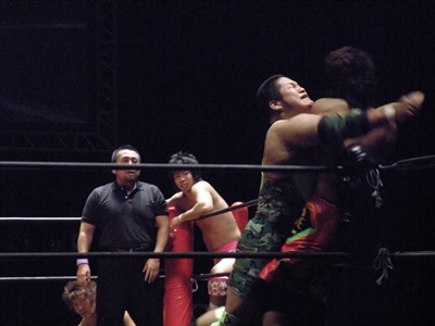谷口が安部をロープ際まで追い込んでスピアー(右写真)、入江にタッチ。