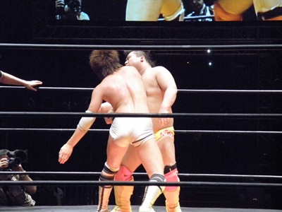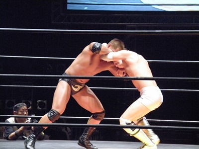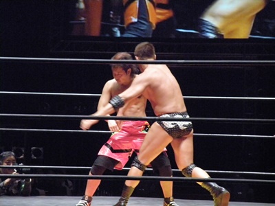 先発は高尾と谷口。ロックアップ(左写真)、谷口がロープに押し込む、ブレーク。