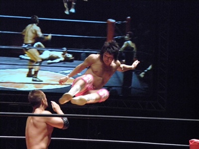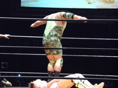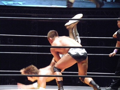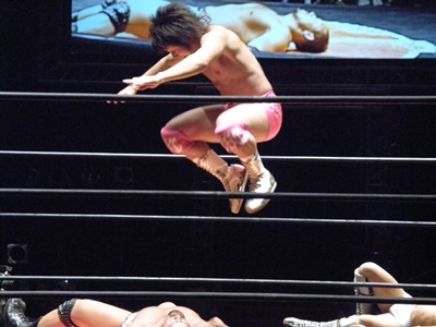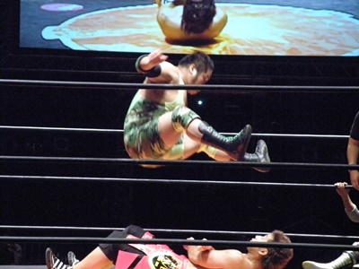 谷口ロープに振る、高尾切り返してドロップキック、ロープに飛んでもう一発(右写真)、石井にタッチ。