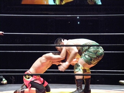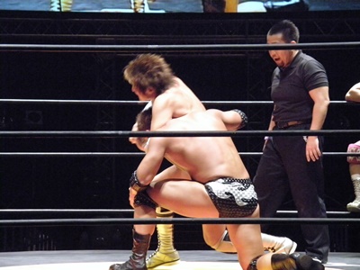 入江キャメルクラッチ(左写真)、高尾ロープ。5分経過。入江は谷口にタッチ。