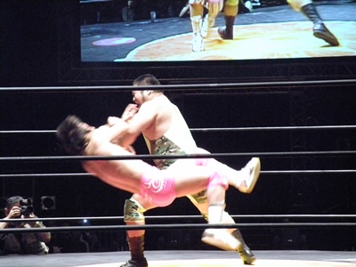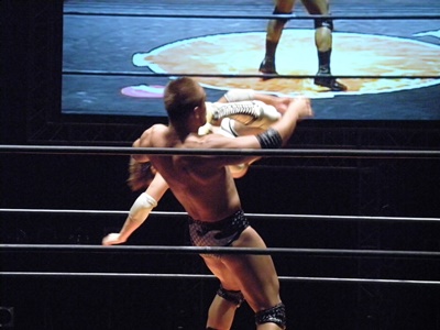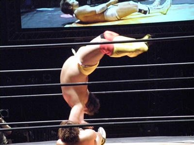 高尾ブレーンバスター狙う、伊橋ブロックして逆に持ち上げる(右写真)、高尾はDDTに切り返す。伊橋の頭が垂直にマットに突き刺さる。カバーはカウント2。